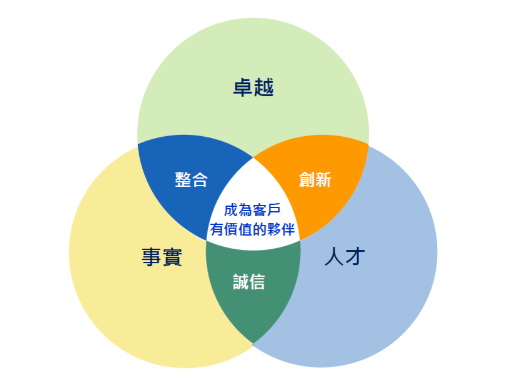 【事實】去除表面,做最有價值的事。 【人才】創造激勵同仁通於挑戰的文化。 【卓越】不斷超越自己與客戶的期望。 |